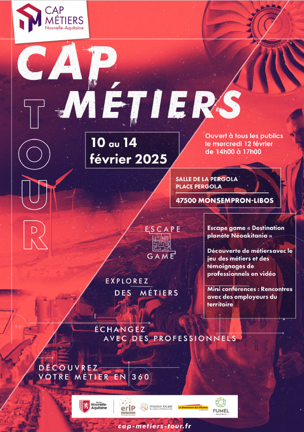 Le Cap Métiers Tour a fait halte à Monsempron-Libos, du 10 au 14 février 2025, marquant une nouvelle étape mémorable de son parcours en Nouvelle-Aquitaine. Ce forum itinérant a une nouvelle fois rempli sa mission : permettre aux jeunes, notamment collégiens et lycéens, de découvrir les métiers, les secteurs d’activité et les formations de manière immersive, ludique et concrète.