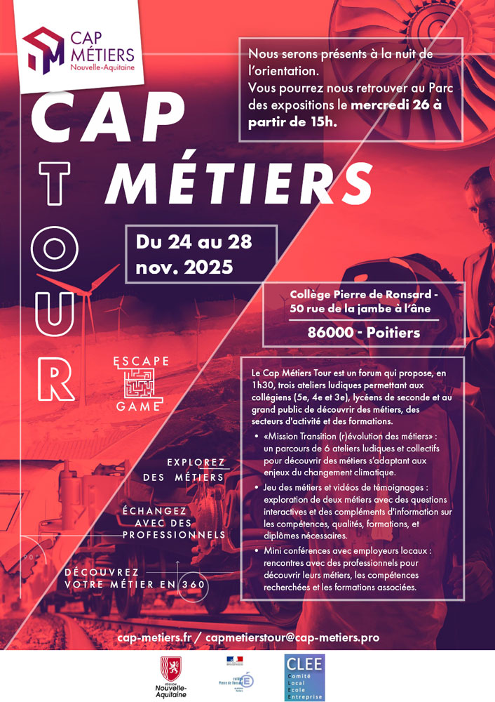L’étape à Poitiers du Cap Métiers Tour avait pour objectif d’emmener collégiens, lycéens, jeunes, familles, professionnels et partenaires à la découverte du monde du travail, des métiers, des formations et des opportunités du territoire. Cet évènement a été organisé en partenariat avec le Comité Local Ecole Entreprise.